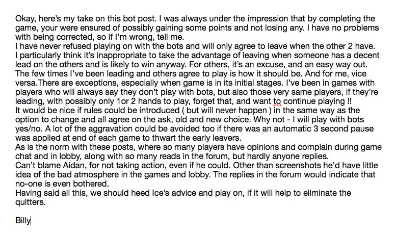 6. Regarding the remaining 3 players continuing the game, I think this is an issue. Many players (including me) do not like playing with a bot. However, if the quitters are going to be punished its essential to carry on with the game.